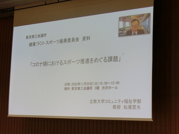 はじめに、「スポーツ機運盛り上げに向けた施策について」と題して、スポーツ庁健康スポーツ課課長補佐の吉野賢一氏にご講演いただき、続いて、「コロナ禍におけるスポーツ推進をめぐる課題」と題して、立教大学コミュニティ福祉学部教授の松尾哲矢氏に、オンラインにてご講演いただきました。