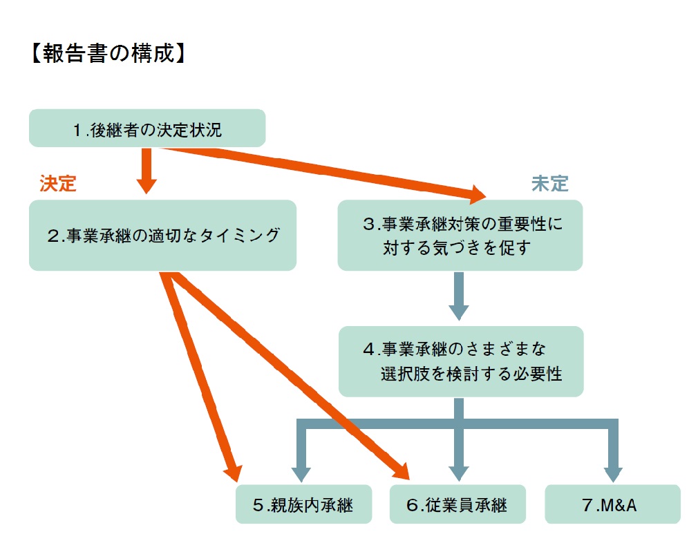 本報告書ではアンケート結果による現状を踏まえ「後継者を決定する重要性」や「後継者年齢を考慮した経営の承継」など、今後の事業承継の方向性や対応策を紹介しています。