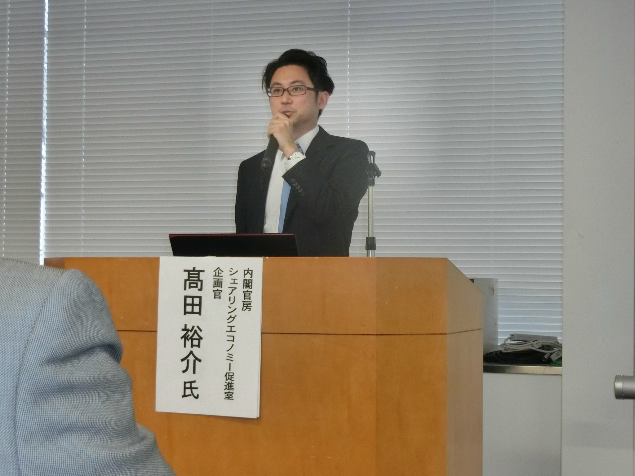 第1部では、内閣官房シェアリングエコノミー促進室 企画官 髙田裕介氏より、「日本におけるシェアリングエコノミーの展望と課題」と題し、シェアリングエコノミーの概要や推進状況、自治体の取組みなどについてお話がありました。