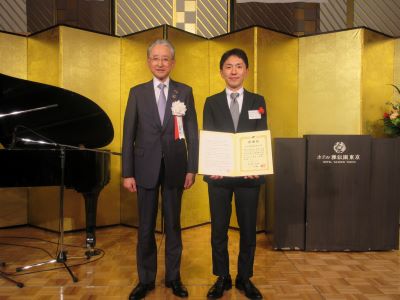 第一部式典の冒頭に、東京音楽大学(目黒区上目黒1丁目9−1)の卒業生で構成されるTCMオーケストラアカデミーの3名が「新春の調べ」と題して新春ミニ演奏会を行いました。三重奏の豊な音色が会場を包み、参加者は新春らしい華やかな調べに熱心に耳を傾けていました。その後、永きにわたり当所にご入会いただいている会員へ感謝状・記念品を贈呈する「永年会員表彰」を執り行い、加入年数30年、40年、50年、60年を迎える永年会員を代表して、60年表彰の安立計器(株)・仙北屋社長に登壇いただきました。