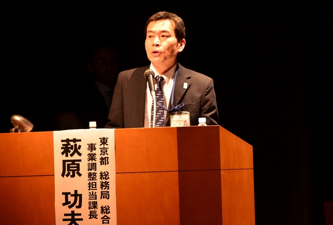 第一部では、「東京都帰宅困難者対策条例について」と題し、東京都総務局総合防災部の萩原功夫事業調整担当課長から、帰宅困難者対策についての詳細および条例の説明がありました。(テキストの一部は以下の通り)
