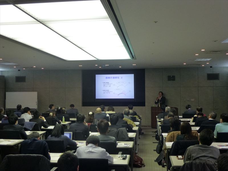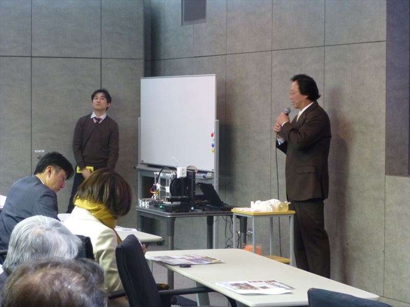 講師にアイオライト株式会社の代表取締役・池田法雄氏を迎え、講義では3Dモデリングの概要、3D不良データの例や、各種3Dプリンターの特徴などについて、詳しい解説がなされました。また、会場内には3Dプリンターを設置したコーナーを設け、実際にABS樹脂を使って試作品を出力する実演も行われました。試作品が参加者に回されると、参加者は興味深そうに眺めていました。