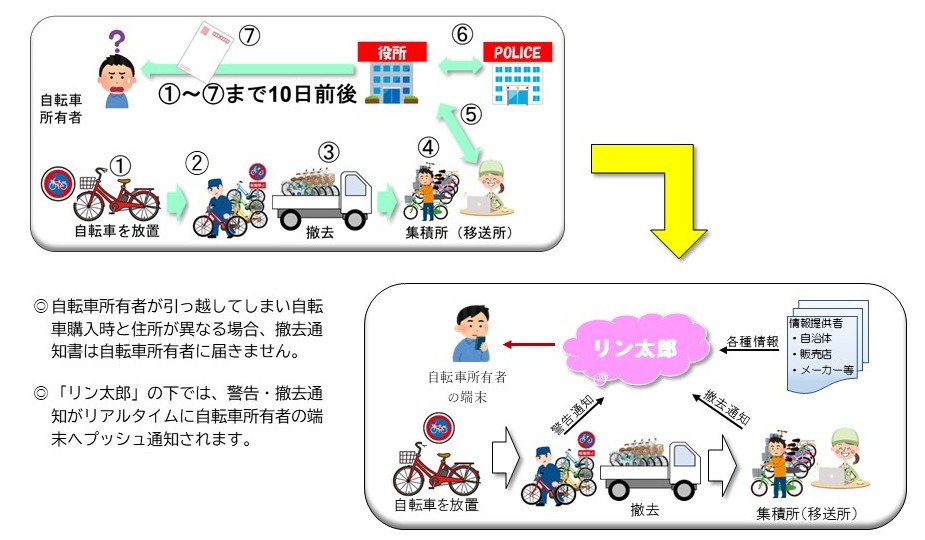 上記システム導入後、さらに2つの取り組みを行いました。1つ目は、放置自転車対策アプリ「リン太郎」の開発です。利用者が事前に自転車情報(防犯登録番号、車種、写真等)をこのアプリに登録しておくことで、撤去時の通知や盗難時の捜索支援が可能となります。新たな事業の柱として、構想自体は以前からありましたが、費用面の課題から実現には至っていませんでした。