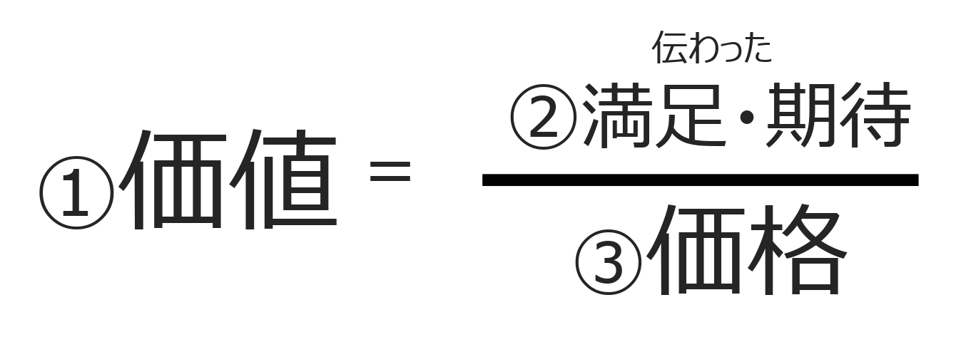大企業なら、潤沢な資金や大量仕入れを背景に、「③価格」を下げて価値を高める安売り戦略も可能ですが、中小企業では太刀打ちできません。私たちが取るべきは、「③価格」を上げ、それ以上に「②お客様に伝わった満足・期待」を高めて価値を増やす戦略です。皆様も、「安い」以外で買い物をするはずです。趣味のもの、失敗できない“ここ一番”のもの、大切な方への贈り物など。「安くなかったけど買って満足した瞬間」を思い出し、自社の商品やサービス強化に反映させましょう。