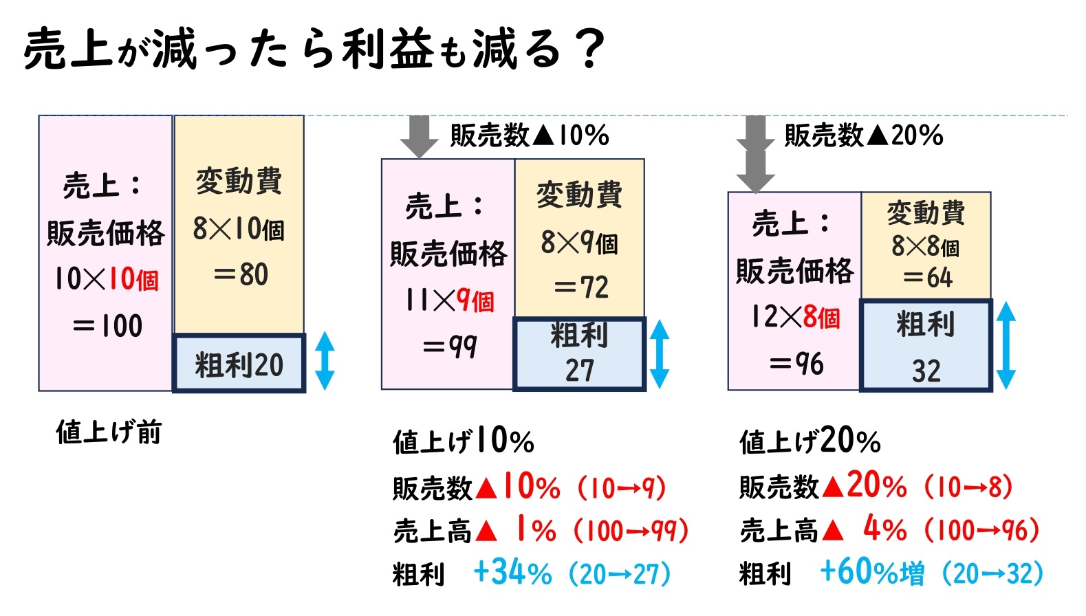 下の例では、1割の値上げ後に販売数が1割減少し、2割の値上げ後には2割減少しています。売上は減りましたが利益は6割増えました。薄利の商売では、このようなことも起こるのです。