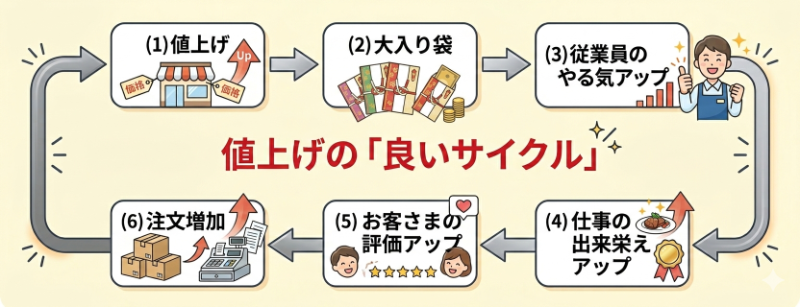 ・良いサイクルを回す:値上げで得た利益の一部を、「大入り袋」などで従業員に還元するのも良い方法です。従業員満足は接客や技術の質を高め、顧客満足度向上につながります。このサイクルが、将来の値上げ対応力を高めます。
