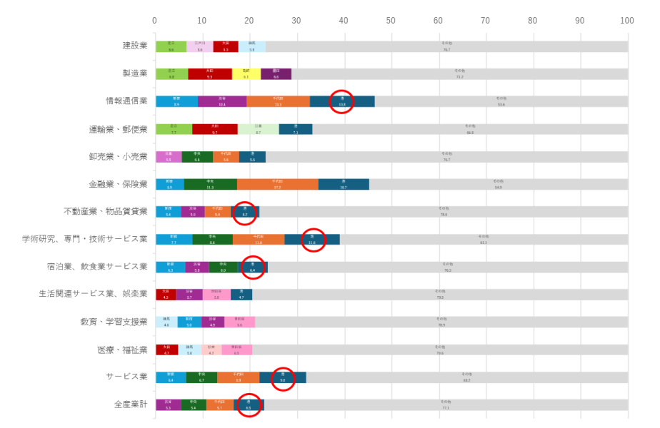港区内事業所では、情報通信業、不動産業・物品賃貸業、学術研究・専門技術サービス業、宿泊業・飲食サービス業、そしてサービス業(他に分類されないもの)が、都内他区市町村に比べ特に多く集積している(図表19)。