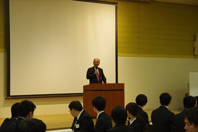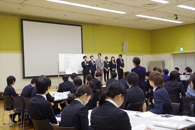 冒頭、阿部会長(丸源飲料工業㈱社長)から受講者へ激励の挨拶があり、その後セミナーがスタートしました。受講者は、6~7名ずつのグループに分かれ、社会人としての心構えをはじめ、挨拶の仕方や名刺交換、電話・来客対応等のビジネスマナーを、2日間のロールプレイで学びました。