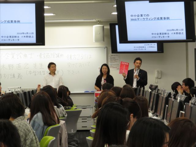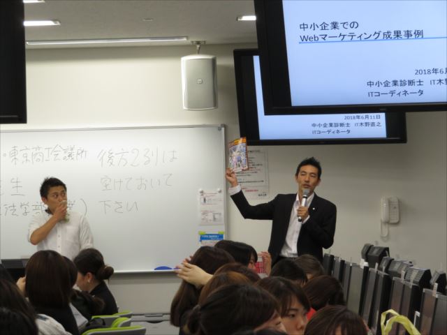 今回の出前授業は東洋大学 国際観光学部の「ウェブマーケティング」の授業の一環で、担当教授の中挟知延子教授から外部講師を招いた授業を実施したいという打診を受けて実現いたしました。東京商工会議所北支部では、この機会を東京商工会議所 創立140周年記念事業と位置付け、授業の最初に「名探偵コナン」とコラボした『まんがでわかる東京商工会議所』と北区の魅力を発信する冊子『TOKYO 北区時間2018 ~このまちの一歩奥へ~』(発行:東京商工会議所北支部)を配布し、東京商工会議所の活動をPRしました。その後、東京商工会議所ビジネスサポートデスク東京北の窓口専門相談員を務める中小企業診断士の木野直之氏から、ウェブマーケティングの概要説明と、経営の現場でどのように実践されているかの事例の紹介を行いました。