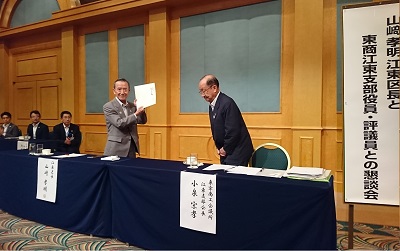 山﨑江東区長との懇談会では、企業の人材不足に対応した区の支援、豊洲市場の千客万来施設、区内創業者の支援、2020年東京オリンピック・パラリンピックに向けた円滑な物流確保やインバウンド対策への支援等について活発な意見交換が行われました。その後、小泉江東支部会長より、山﨑江東区長へ産業振興政策に関する要望書を提出しました。