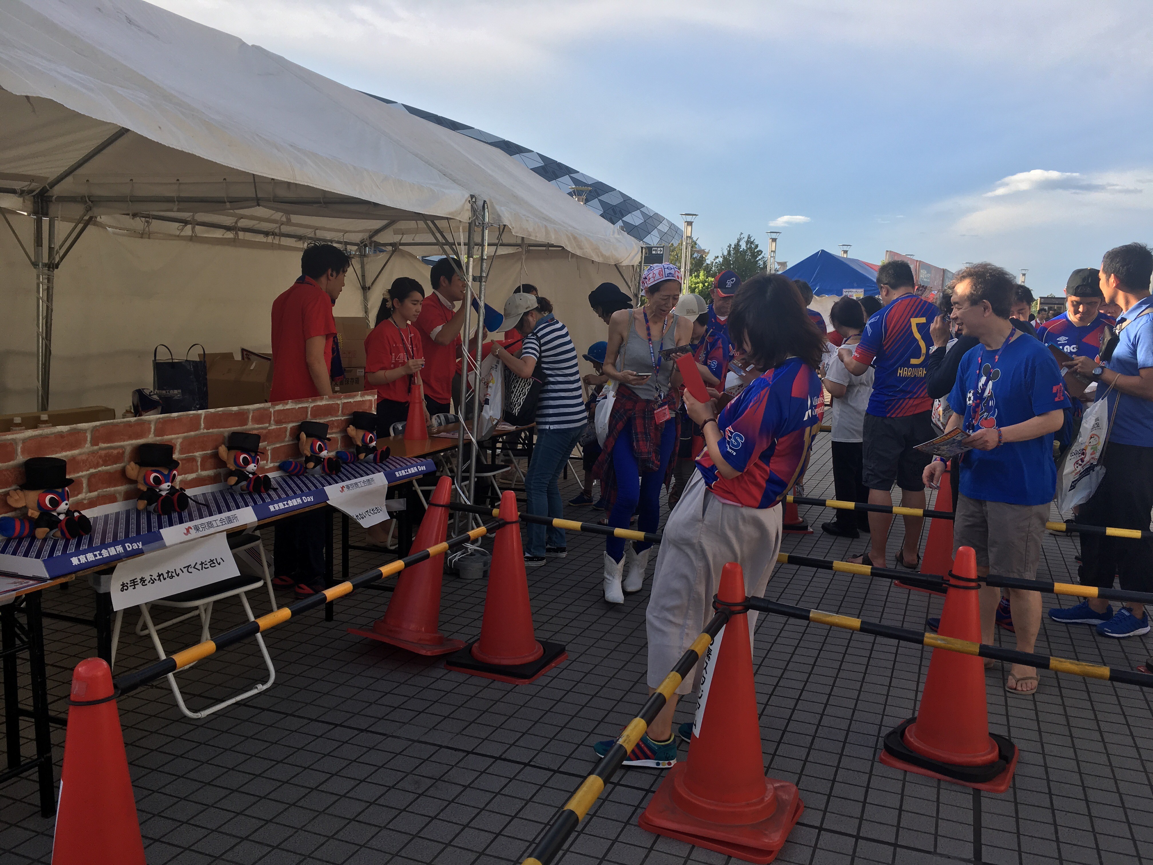 当日はビジネス・会員交流委員会池田朝彦委員長と東京京商工会議所西尾常務理事による両チームのキャプテンへの花束贈呈や、会場では、FC東京とコラボをして制作した、「創立140周年記念 東京ドロンパぬいぐるみ 渋沢栄一モデル」や「オリジナルペットボトルホルダー」が当たるプレゼント抽選会が行われたほか、東京商工会議所特設ブースでは、東京商工会議所に関するクイズに答えてオリジナル缶バッジをプレゼントするイベントを実施し、多くの来場者で賑わいました。