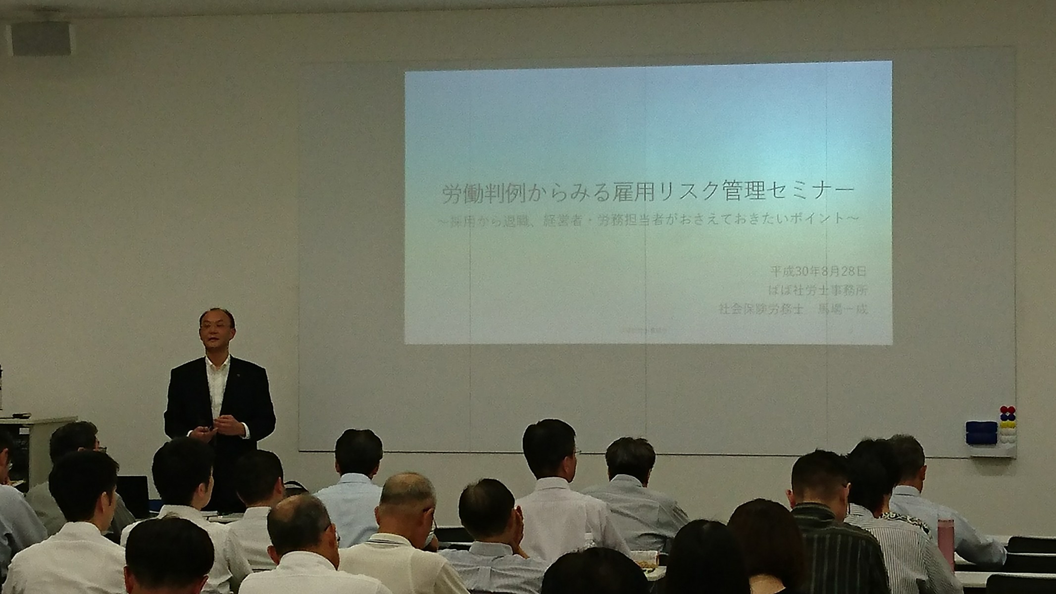 講師の馬場 一成 氏(社会保険労務士)から、採用から退職までにおける豊富な判例の紹介とともに、想定しうる雇用リスクとその防止策について、わかりやすく解説していただきました。