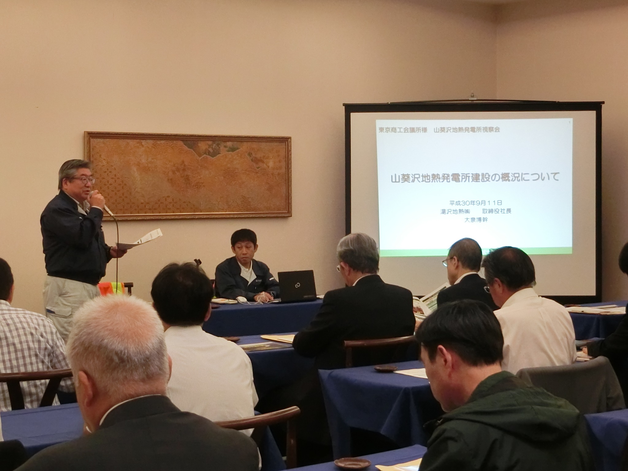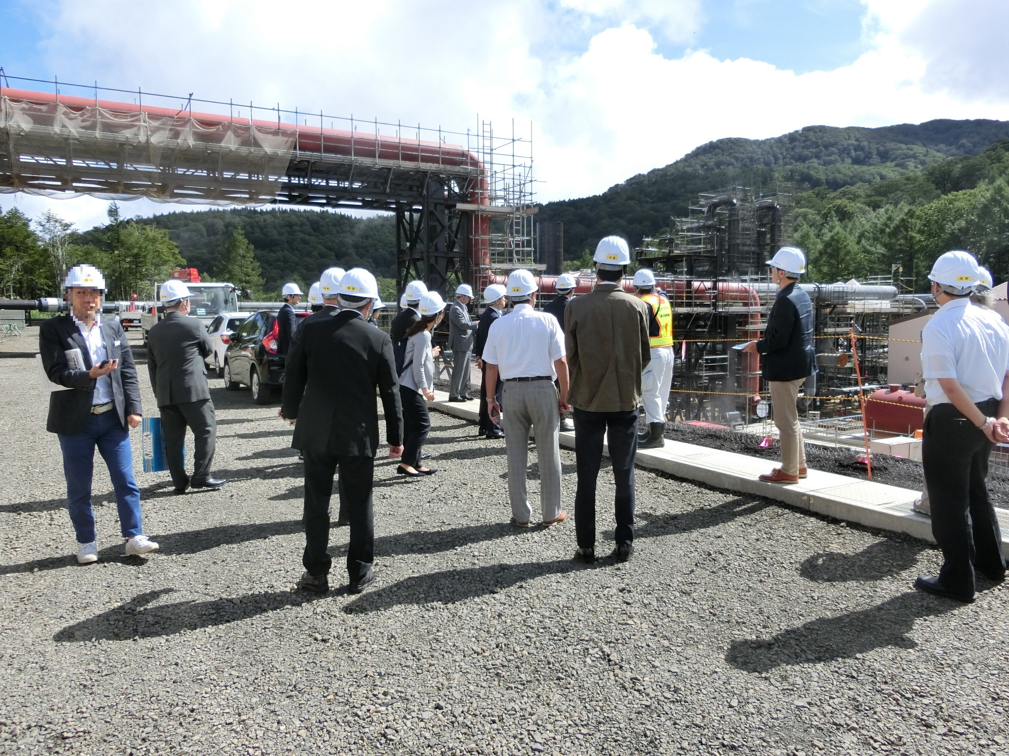 まず、湯沢地熱株式会社の大泉社長を講師としてお招きし、地熱発電の基礎知識と日本の資源状況、山葵沢地熱発電所の建設状況や環境・温泉事業者の配慮努力等についてのセミナーを開催しました。その後、バスに同乗いただき、還元熱水輸送管の建設状況を見ながら山葵沢地熱発電所へ移動し、まさに発電設備の建設が進む様子を見学しました。来年開業予定の山葵沢地熱発電所の建設状況を見ることができる貴重な機会となりました。