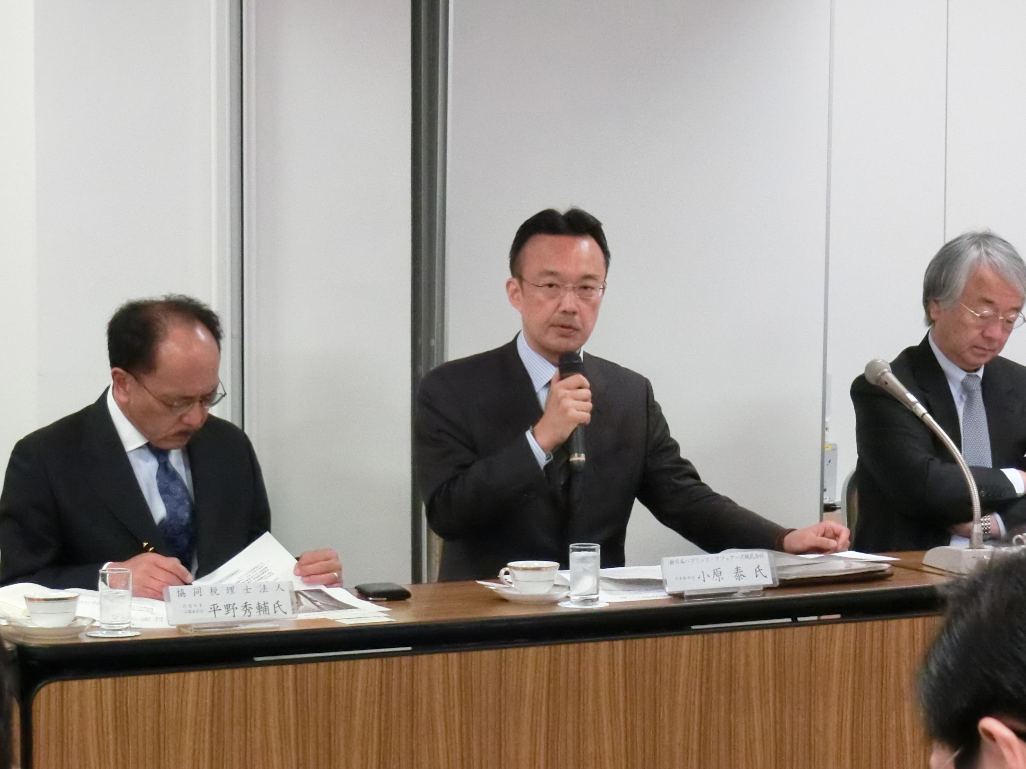 初めに、新日本パブリック・アフェアーズ株式会社 代表取締役の小原 泰 氏、協同税理士法人 代表社員の平野 秀輔 氏の両名から、「長期的な経営を支援するための事業承継税制について~ドイツの例を参考に~」について講演を聞き、意見交換を行いました。その後、9月に予定している平成30年度税制改正に関する意見の取りまとめに向けての論点整理を行いました。