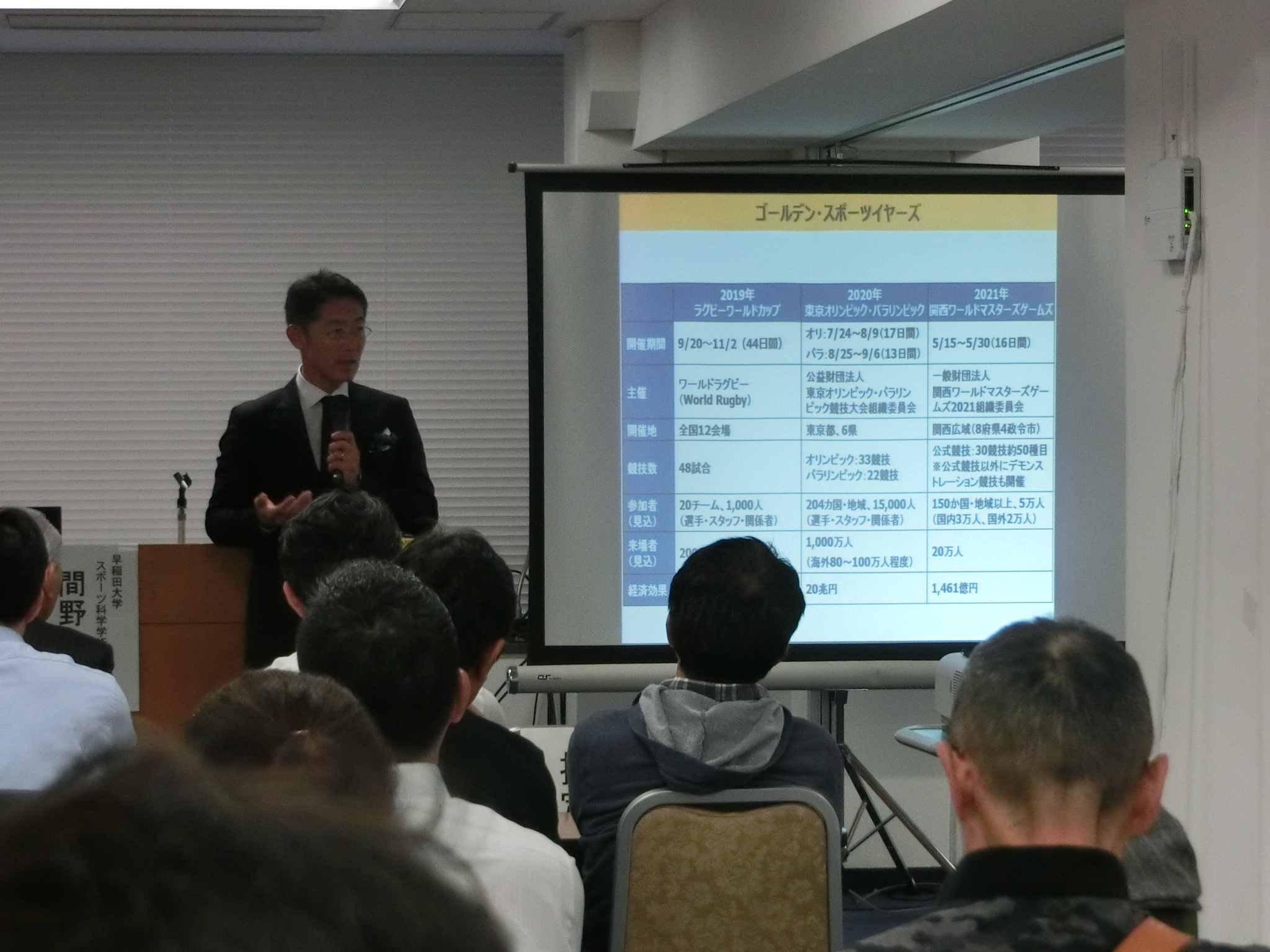 また、続く第2部では、「スポーツ産業変革期!!今後のスポーツ産業コンテンツの可能性」と題し、早稲田大学スポーツ科学学術院教授 間野義之氏よりお話を伺いました。同氏は、2019年から2021年にかけて、ラグビーワールドカップ、東京オリンピックパラリンピック、ワールドマスターズゲームズといった世界的なスポーツイベントが3年続けて日本で開催される中で、日本のスポーツ市場拡大への課題を指摘。具体的には、米欧のスタジアム・アリーナで進むIT化の事例を参考にした日本のスタジアム・アリーナ改革やスポーツ分野と他産業との融合の必要性などについて講演されました。
