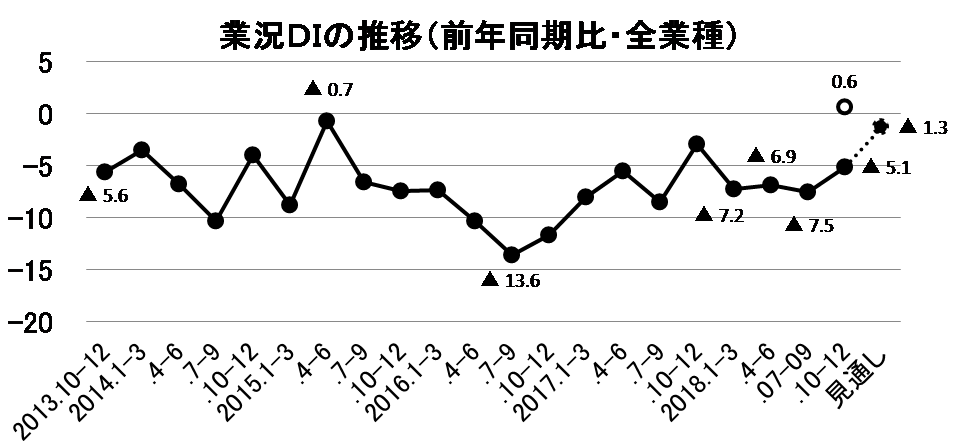 ○「業況DI」(前年同期比・全業種)は前期(7~9月期)と比べ、2.4ポイント改善の▲5.1となった。