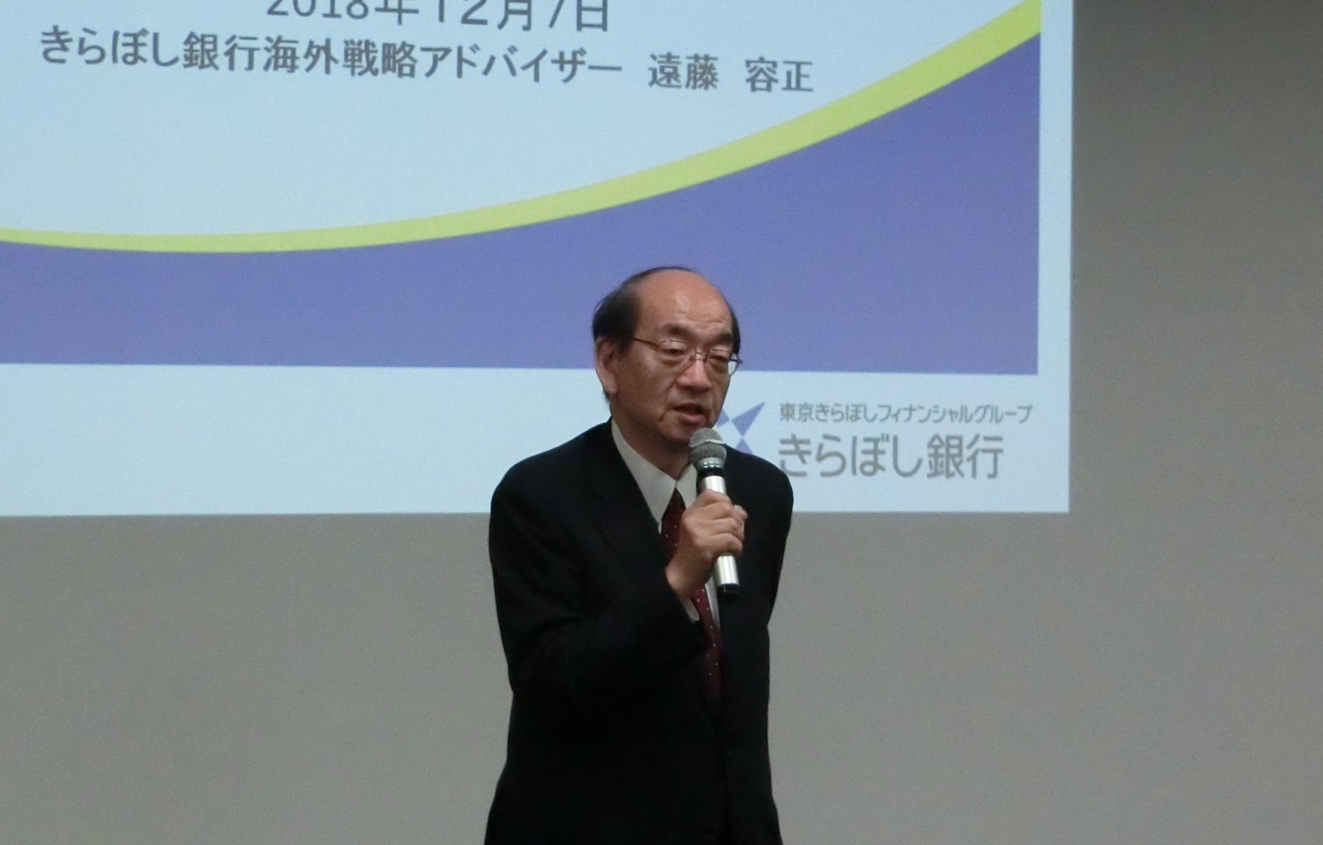 冒頭、中小企業国際展開推進委員会の柿﨑共同委員長より開催挨拶をしたのち、第一部では株式会社きらぼし銀行 コンサルティング事業部 海外戦略アドバイザー 遠藤 容正氏より、フィリピンの最新ビジネス事情と題し、フィリピンの概要、経済動向や日系企業の進出状況のほか、メリット・デメリットの両面よりご解説いただきました。第二部では、進出企業の事例紹介として、バンダイ株式会社 代表取締役 野崎 浩良氏よりご講演いただきました。