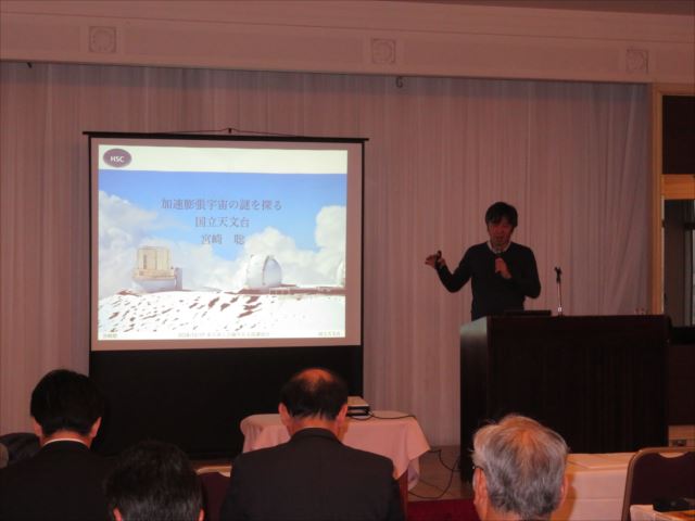 本事業は、新たなビジネスのヒントにしていただくことを目的に、先端研究に関心をお持ちの中小企業の経営者・技術者に、最新の研究をご紹介する全4回の連続イベントです。今回はその第3回目として、2本立ての講演会を行いました。第一部では天文学をテーマに、国立天文台 先端技術センター 准教授の宮崎聡氏を講師に迎え、「すばる望遠鏡広視野カメラ Hyper Suprime-Camで探る加速膨張宇宙の謎」と題してご講演をいただき、第二部では遺伝学をテーマに、国立遺伝学研究所 産学連携・知的財産室 室長の鈴木睦昭氏を講師に迎え、「遺伝学の発展により生活はどう変わるのか?」と題してご講演をいただきました。