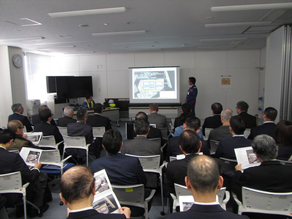 視察会では、国土交通省 関東地方整備局 東京空港整備事務所長より概要説明を受けた後、空港処理能力拡大に必要な着陸計器装置の強化(滑走路ローカライザ)や国内外間アクセス改良(際内トンネル)、またD滑走路接続部(4本目の滑走路)、空港跡地活用に向けた工事現場等を、それぞれ説明を受けながら視察しました。