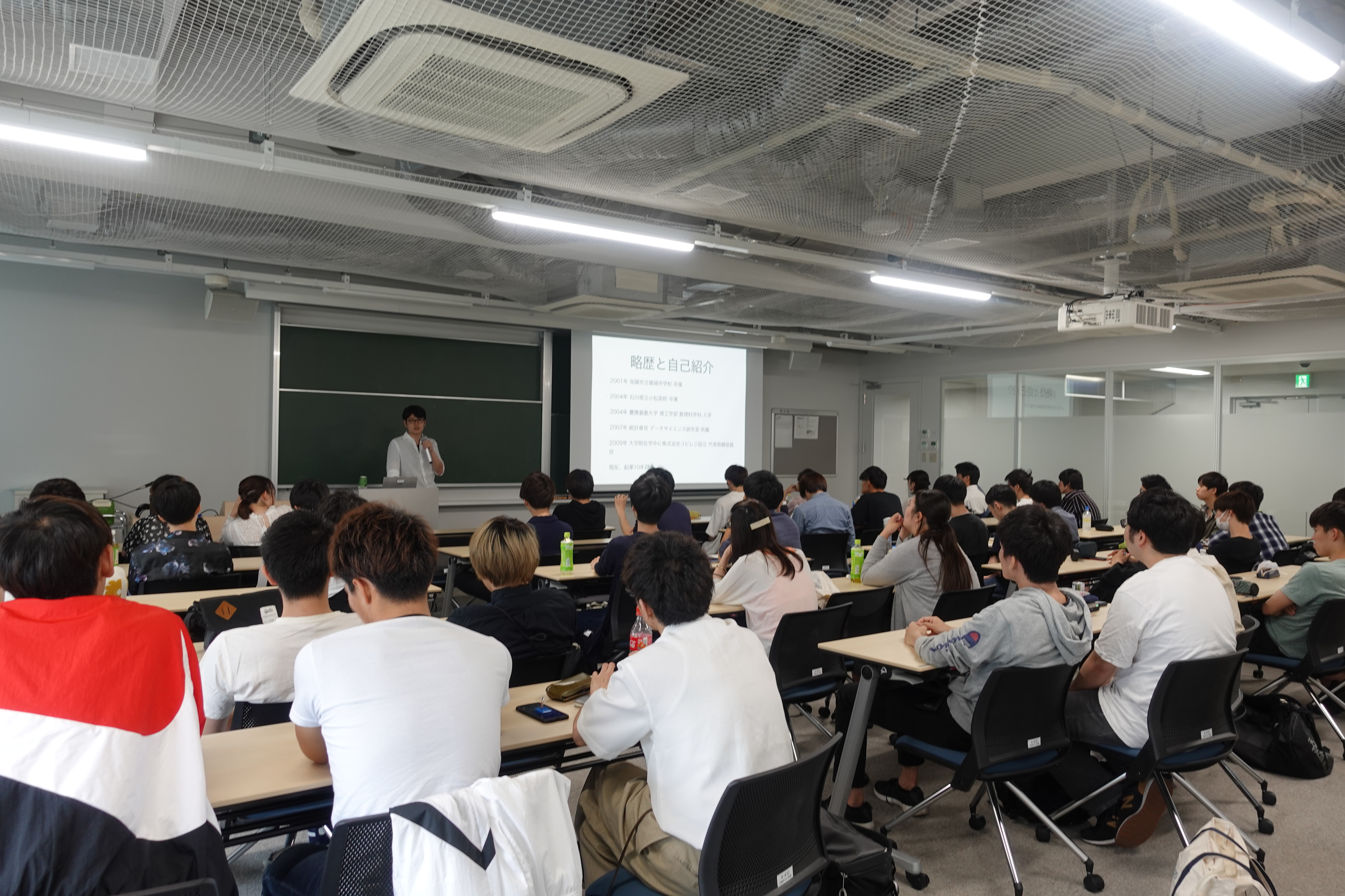 講演では、データサイエンスを専攻していた木戸社長から、数理工学がインパクトを与えるビジネス領域がたくさんあることや、その知識と、学生時代のアルバイトでの実体験からビジネスアイディアが生まれた起業ストーリーなどについてお話いただきました。また、学生に対して、「やりたいことをやり残して後悔しないよう、既存の枠組みを取り払い、視野を広げてチャレンジしてほしい」と語られました。