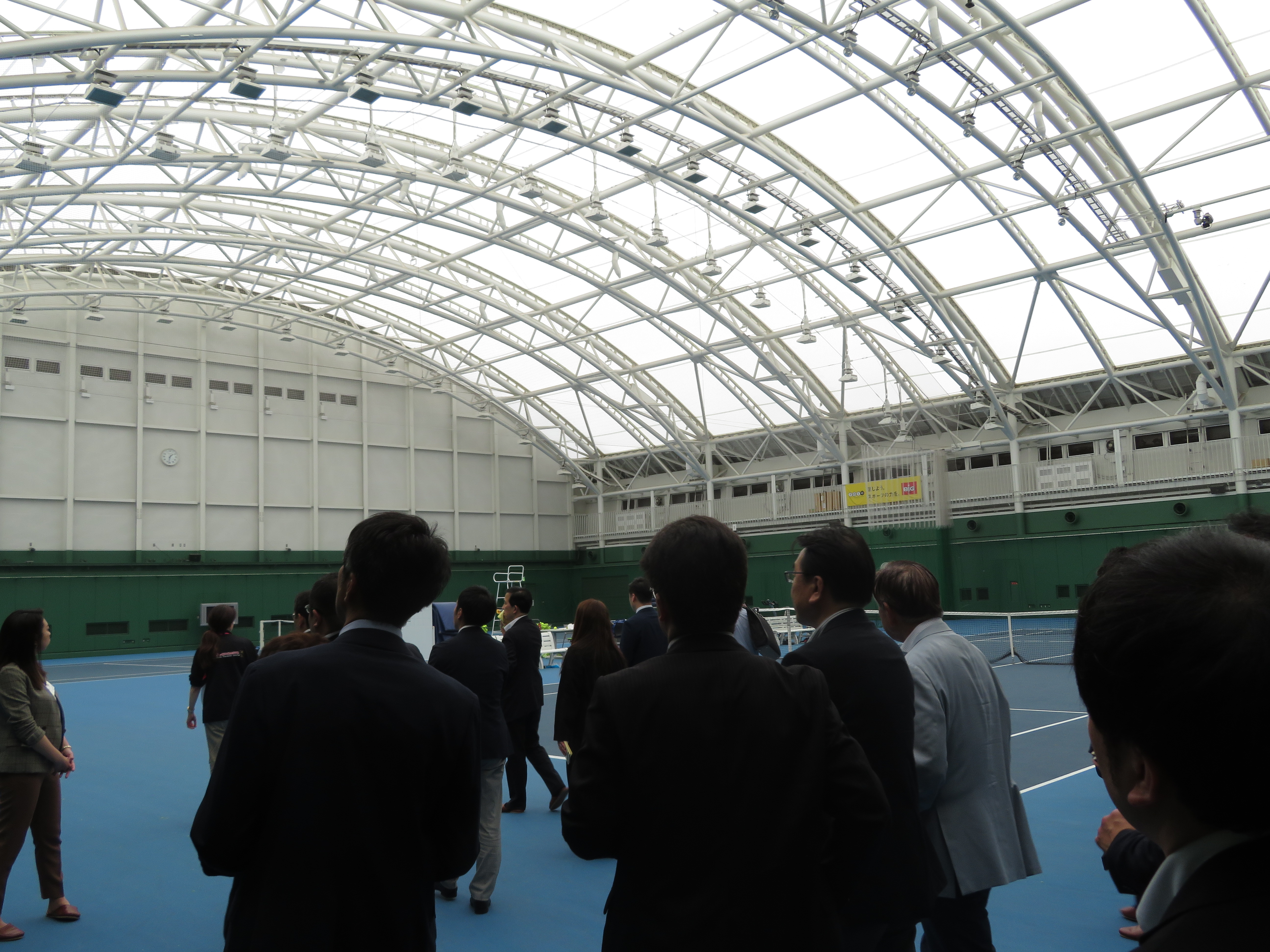 説明会に先立って希望者を対象に行われた施設見学では、ボクシング、レスリング、テニスなどの競技の、トップアスリートが実際に使用する練習場に入り説明を受けました。