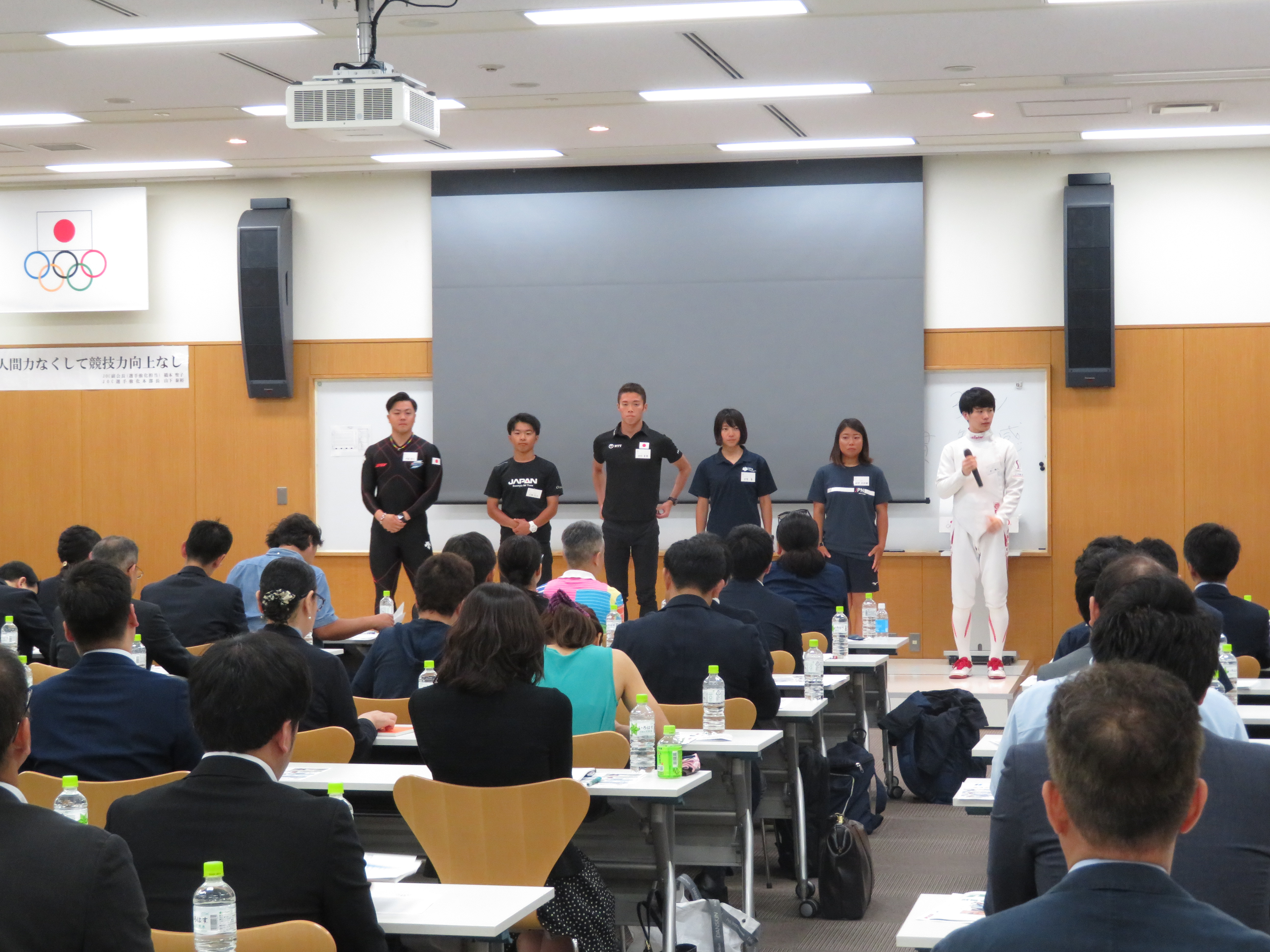 説明会では、主催者・共催者挨拶、「アスナビ」概要説明に続いて、実際にアスリート採用実績のあるオリエンタル酵母工業株式会社から採用事例やアスリートの活動実績について紹介が行われました。その後、2016年リオデジャネイロオリンピックにフェンシング・サーブル代表として出場した徳南堅太氏より、採用企業、就職希望アスリートへ向けてメッセージが送られました。最後は、就職を希望するアスリート6名により熱のこもった自己PRが行われました。