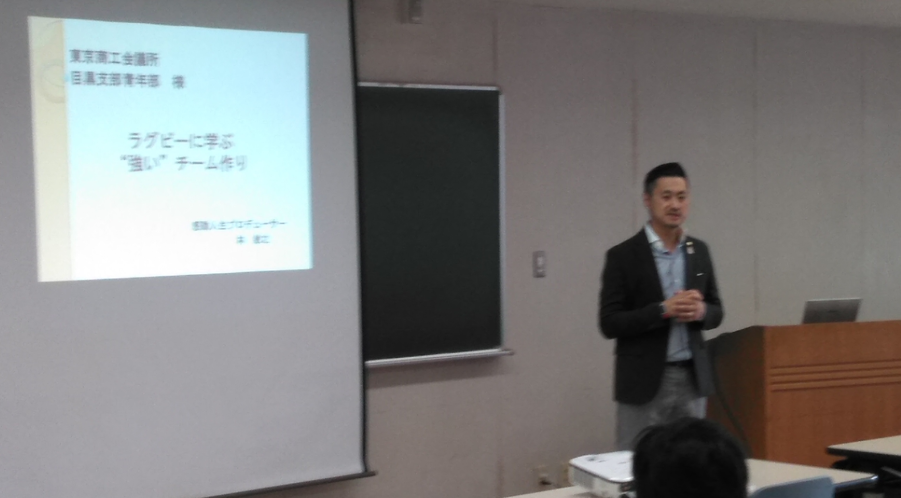 例会では、ラグビー元日本代表でキャプテンを務められた林敏之氏をお呼び、「ラグビーに学ぶ“強い”チームづくり」をテーマにご高話いただきました。ラグビーを通じて学んだことやチームの中での自分の存在など、経験に基づいた感情のこもった「熱い」お話をいただきました。