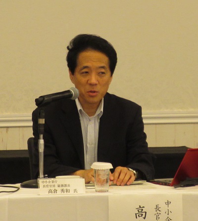 当日は、中小企業庁長官官房総務課長である高倉 秀和 氏から「中小企業の生産性向上に関する今後の政策の方向性について」と題して講話をいただきました。高倉課長からは、中小企業を巡る構造的課題と、その解決策となる「事業の新陳代謝」および「生産性向上」を促進するための政策動向について説明いただきました。