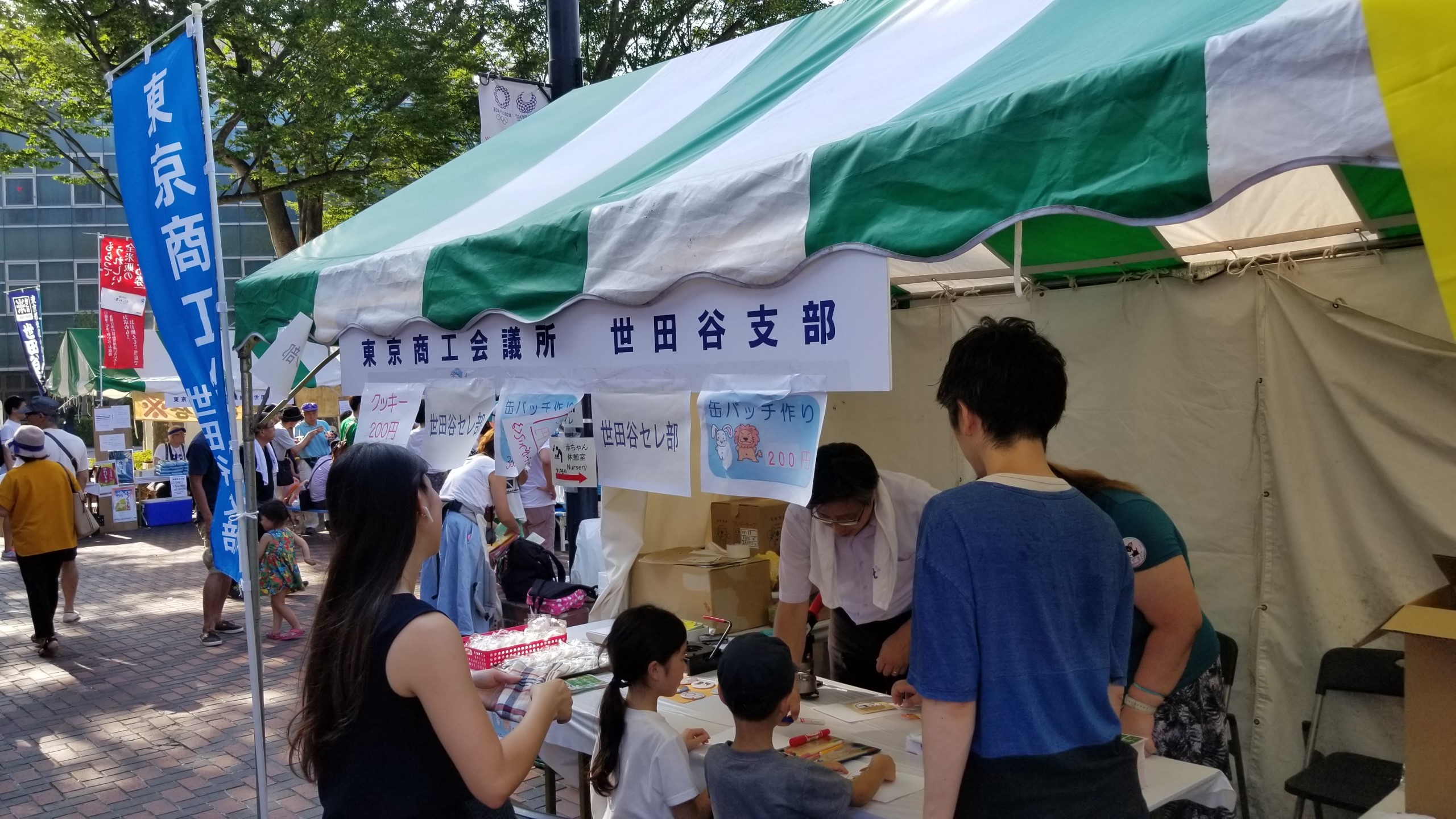 世田谷支部では、会員の皆様からご協賛をいただき、当日配布するパンフレットやうちわ、タオルに広告を掲出したほか、「NPO法人障害者支援情報センター」の協力のもとブースを出店しました。ブースでは缶バッジの手作りコーナーの運営、ならびに障害者就労支援施設「風の谷プロジェクト」製造の石鹸および「アンシェーヌ藍」製造の米粉麺を販売し、親子連れなどで賑わいました。