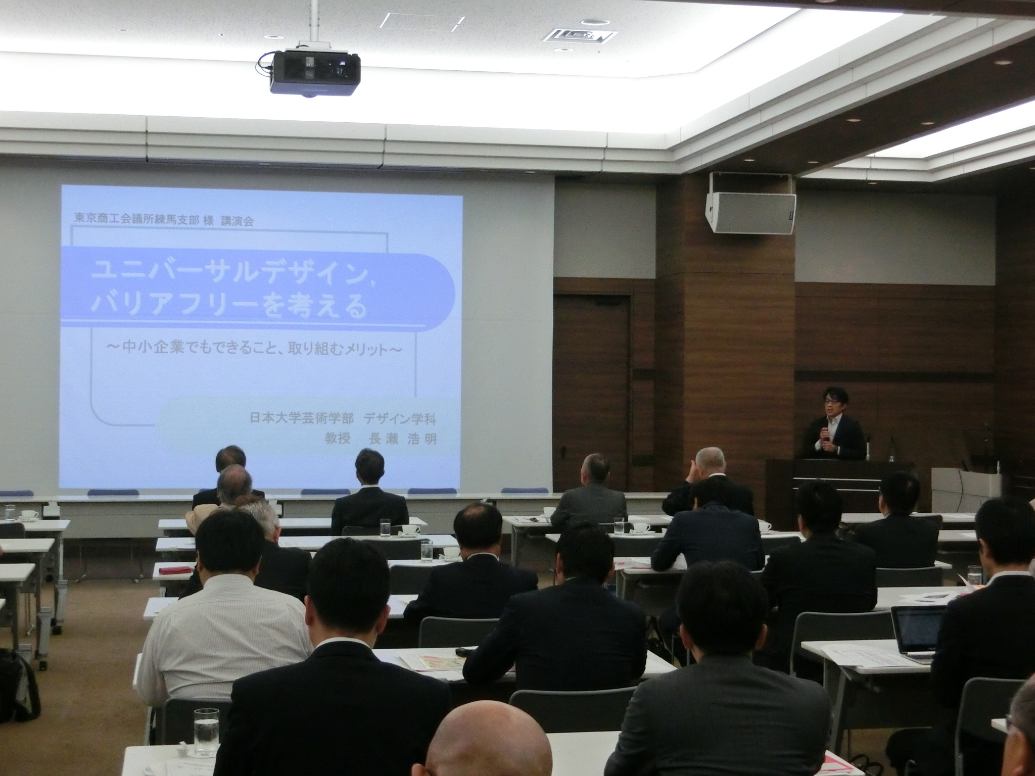 続いて特別講演会として「ユニバーサルデザイン・バリアフリーを考える」をテーマに、日本大学芸術学部の長瀬浩明教授に講演いただきました。ユニバーサルデザインの概念や、日本と欧州の違い、取り組みに当たって大事なポイントなどをお話いただいました。