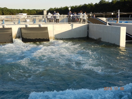 サプライズは、案内人のご配慮でコースに競技同様に水を放流し人工の激流を見学出来ました。水流口を開けると、ものの数分で激流が現れました。参加者一同感謝。カメラのシャッター音も一段と高くなりました。