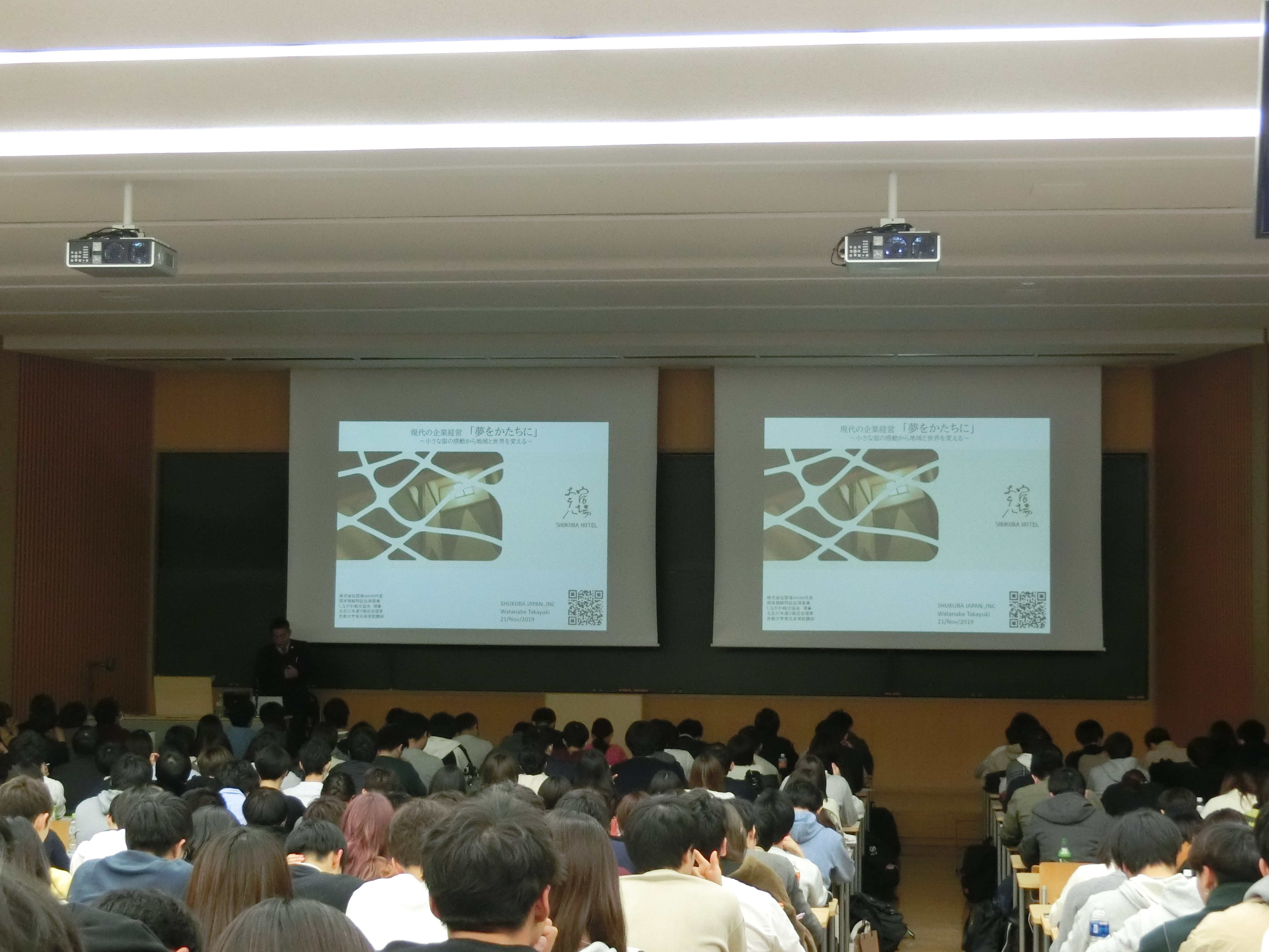 渡邊社長は、多くの協力者に助けられながら修業を積んで起業に至った経緯とともに、「ポイントは、ビジネスチャンスにつながるような問題や課題を見つけること。一見するとおかしなことでも日本中のムーブメントにつながる可能性がある。従業員や客としてその流れに後で参加するのもよいが、起業家としてはじめに取り組むのは気持ちの良いものである」とお話いただきました。
