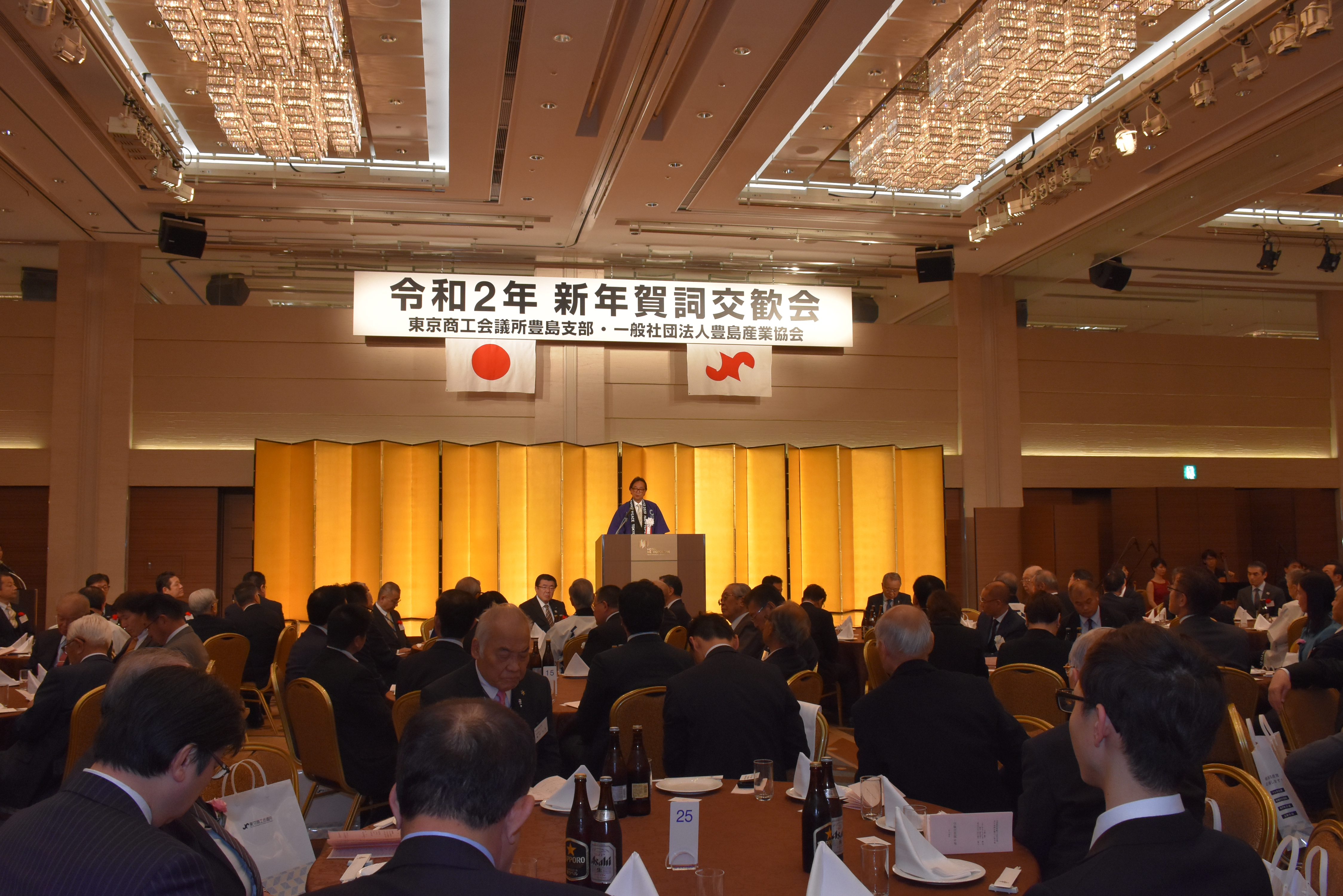 当日は渡邊裕之・豊島支部会長と白井宏一・豊島産業協会会長がオリンピック・パラリンピックイヤーとなる本年の抱負を述べたほか、高野之夫・豊島区長、小池百合子・東京都知事をはじめ、来賓の皆様からもごあいさつをいただきました。