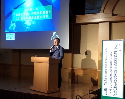 第1部の新春特別経済講演会は、(一社)東京都信用組合協会との共催で、コモンズ投信株式会社・取締役会長・渋澤健氏に「日本・世界経済の展望とこれからの資本主義の行方」と題し今後の日本・世界経済、資本主義が向かう方向性や、実業家渋沢栄一氏の思想と行動の基本であった『論語(= 道徳)』と『算盤(=商売)』について読み解き、現代の経営者にとってそれらがどのような意義を持つかを中心にお話いただき、約200人が出席しました。