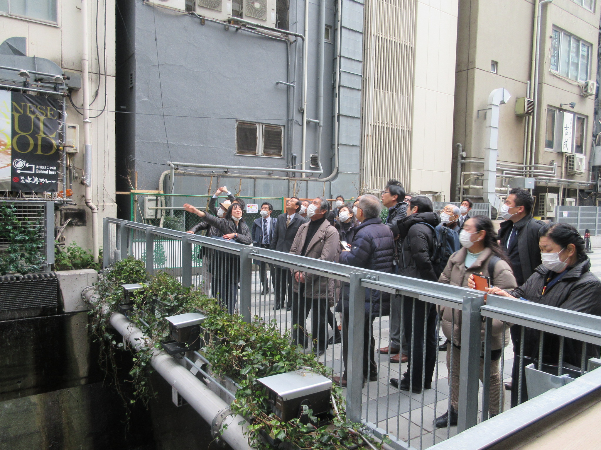 その後は、渋谷スクランブルスクエア内にある共創施設「渋谷キューズ」や渋谷ストリームの脇を流れる渋谷川の現状を視察し、担当者からご説明頂きました。
