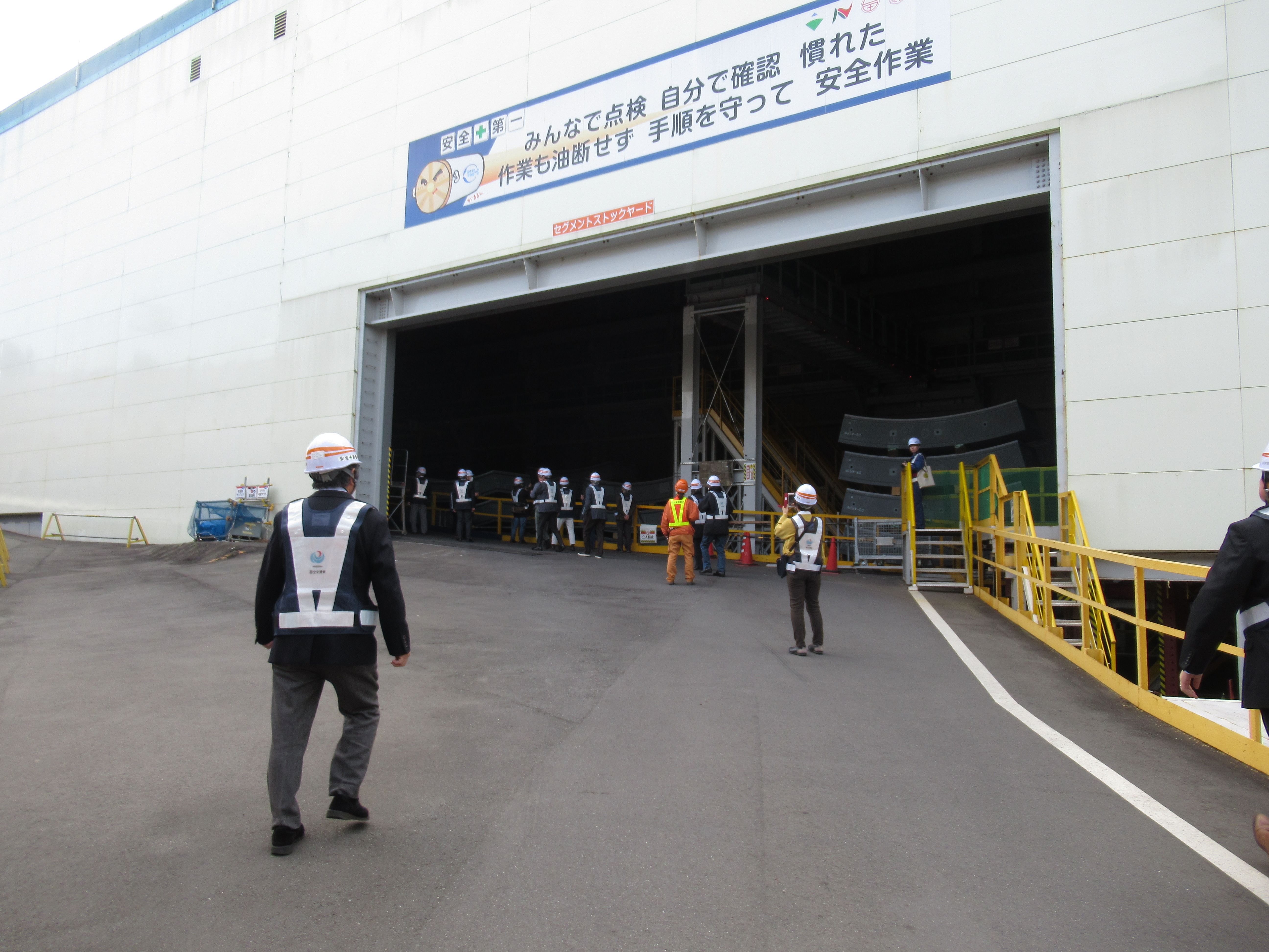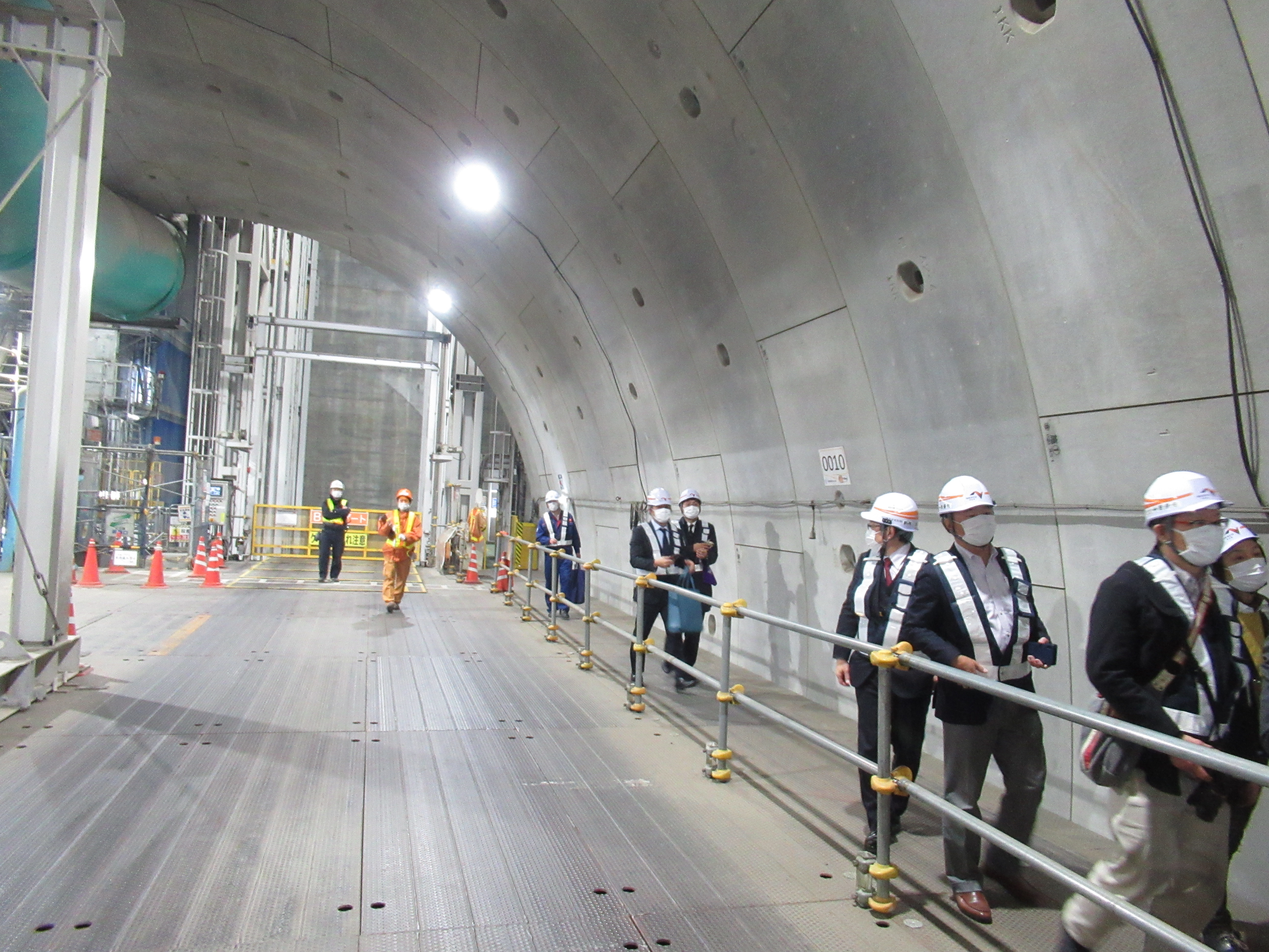 世界的にも最先端と評される日本の土木工事技術を駆使する外環道地下工事現場では、工事の進捗について説明を受けた後に、シールドマシンで掘り進めたトンネルや、トンネルを構築するためのパネル「セグメント」のストックヤード等を歩いて見学しました。
