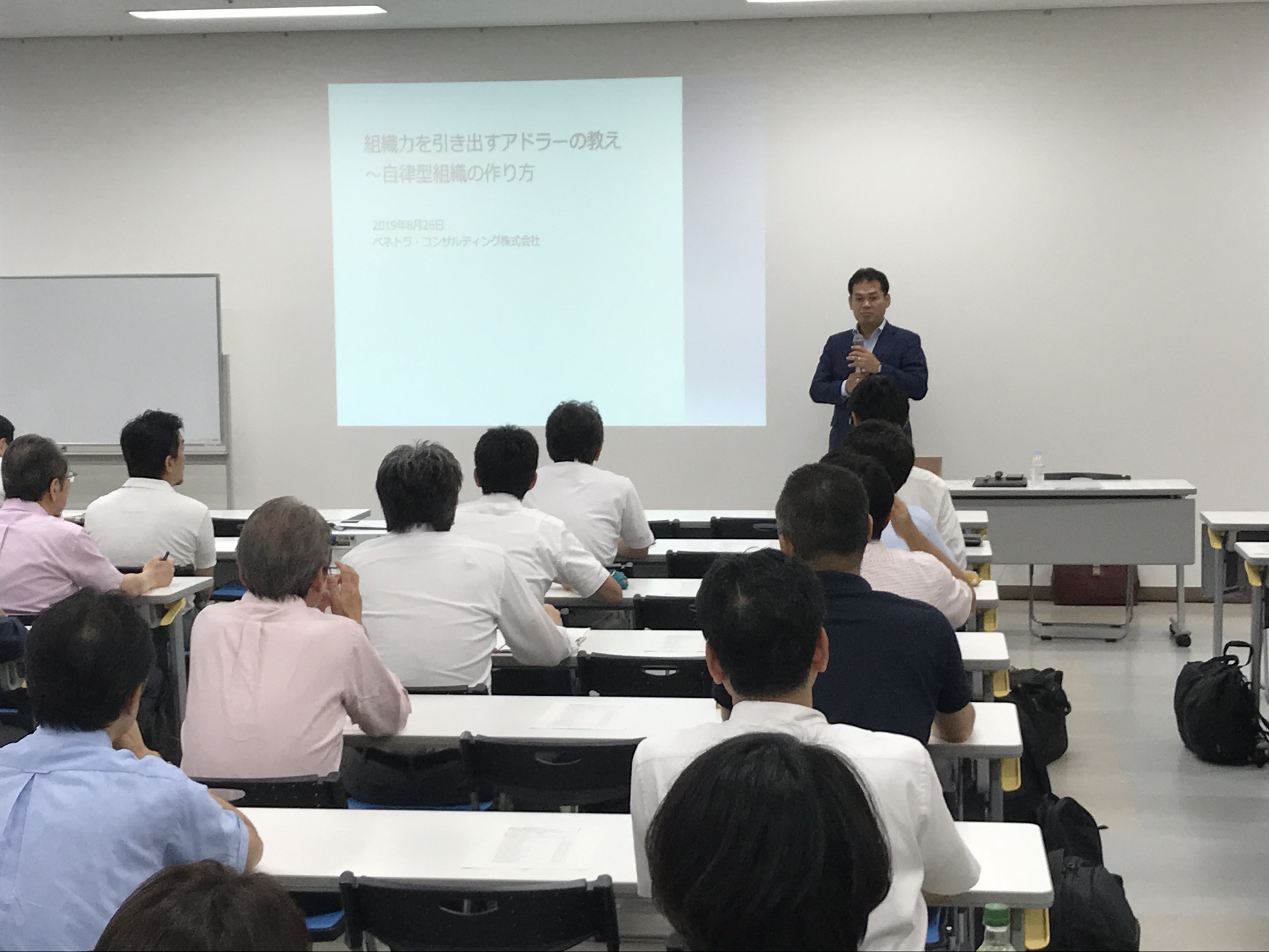 セミナーでは、講師の 安澤 武郎 氏(ぺネトラ・コンサルティング㈱ 代表取締役)が京都大学アメフト部を日本一に導いたチーム作りの経験を紹介しながら、アドラー心理学の考え方をベースにした組織変革の事例を使って、自律型組織を生み出すエッセンスを解説しました。