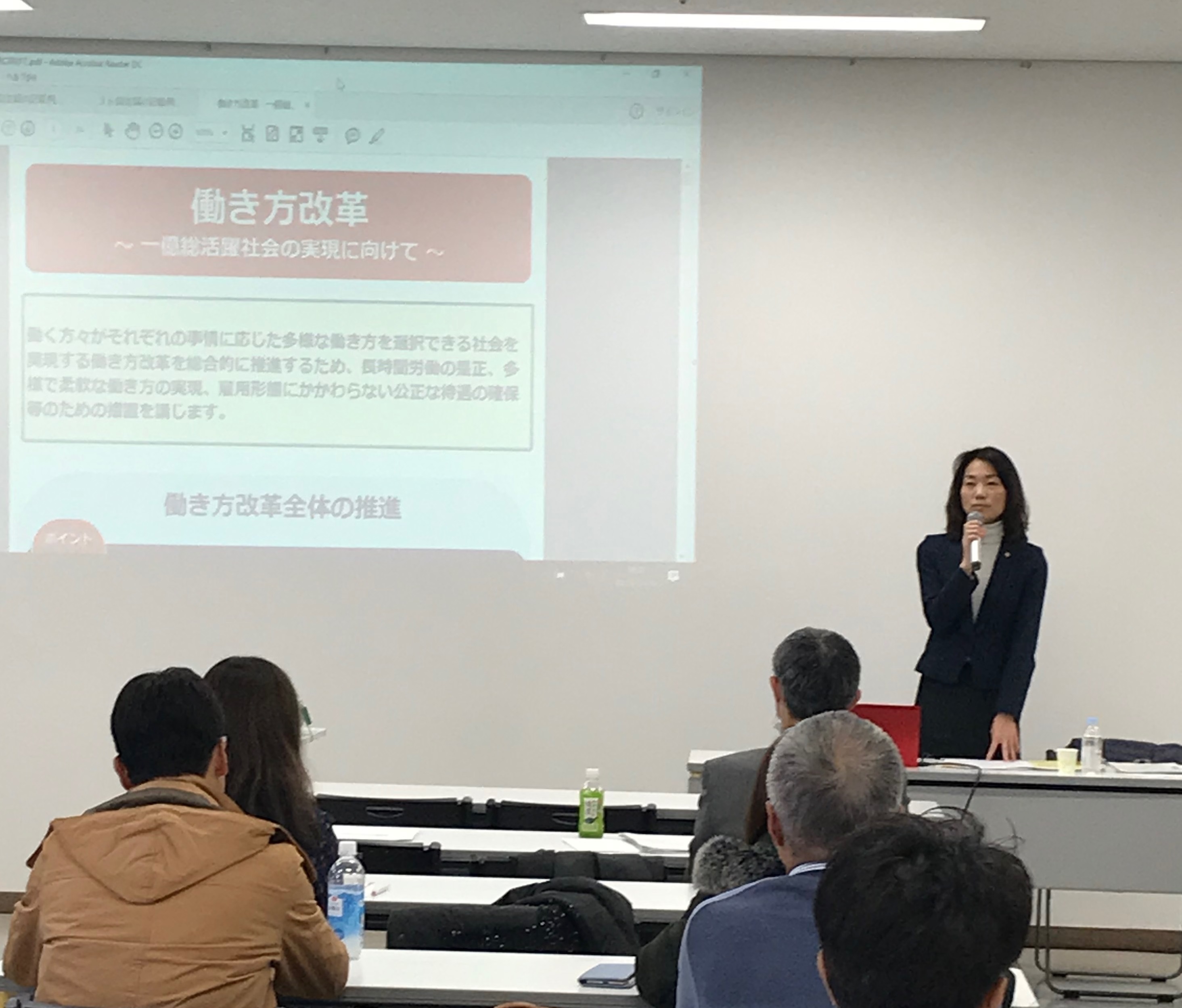 セミナーでは、講師の藤本紀美香氏(社会保険労務士藤本紀美香事務所 代表)が働き方改革への対応について、経営者は具体的に何から始めたらよいのか、ワークも交えながら解説しました。