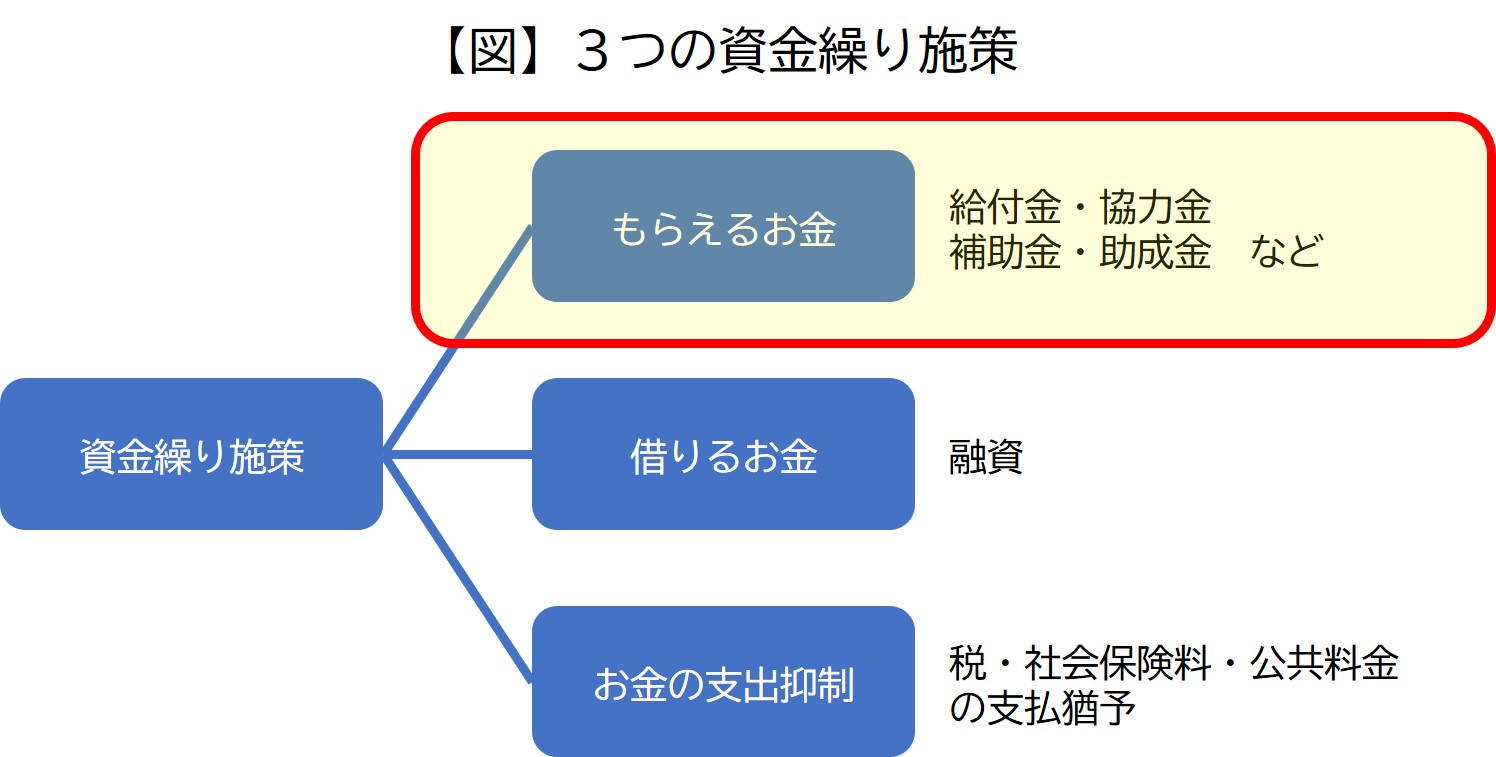 一言で言えば「もらえるお金」です。施策名の最後に「●●給付金」「●●協力金」とあるのを確認してください。似たような言葉に、補助金、助成金、奨励金といったものもありますが、誤解を恐れずに言うならこれらも「もらえるお金」です。なお、資金繰り施策には他に「借りるお金」「お金の支出抑制」がありますが、これは別稿でご紹介します。