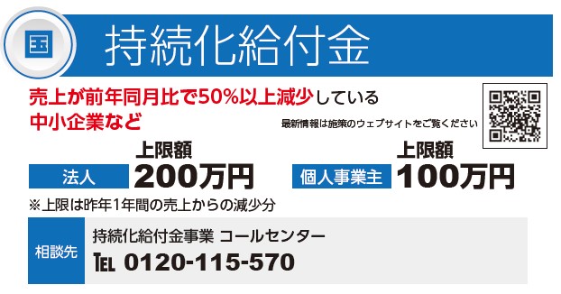 マスコミ報道でも取り上げられていますので、ご存知の方も多いかもしれません。ほぼ全ての業種の事業者が対象となりますので、これは利用を検討しておきたい施策です。ただ、支給要件があります。詳細は、持続化給付金の事務局ホームページをご覧ください。