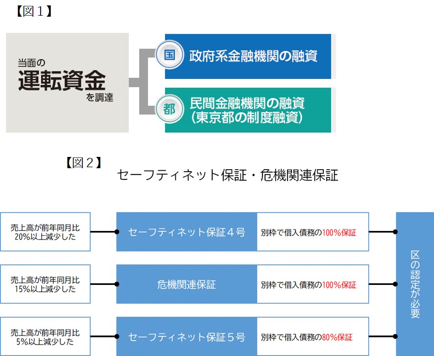 一方、民間金融機関とは、街中でよくみかける「●●銀行」「●●信用金庫」「●●信用組合」などです。コロナ対策として、民間金融機関の融資には「制度融資」という、東京都や23区が関与して融資が受けられやすくなる工夫がされています。ただ、コロナ対策の融資制度を利用する条件として、セーフティネット保証4号・5号、危機関連保証のいずれかの「信用保証制度」を利用することが条件となっていることがあります。