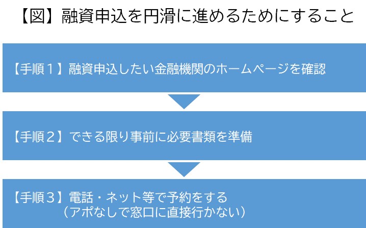 融資申込にあたり、注意したいことがあります。それは、事前準備無しにアポなしで金融機関の窓口に直接行かないことです。融資申込を円滑に進めるために、以下の手順で事前準備するといいでしょう。