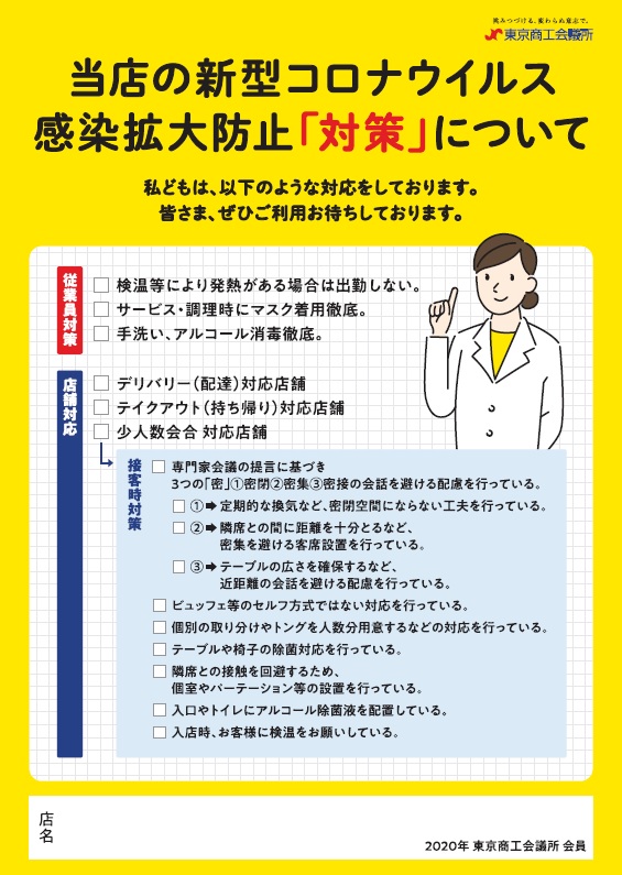 東京商工会議所では新型コロナウイルス感染拡大の影響で厳しい状況に置かれている東商会員である飲食店への誘客の一助となるよう、各店でおこなっている感染拡大防止対策を明示できるポスターを製作しました。