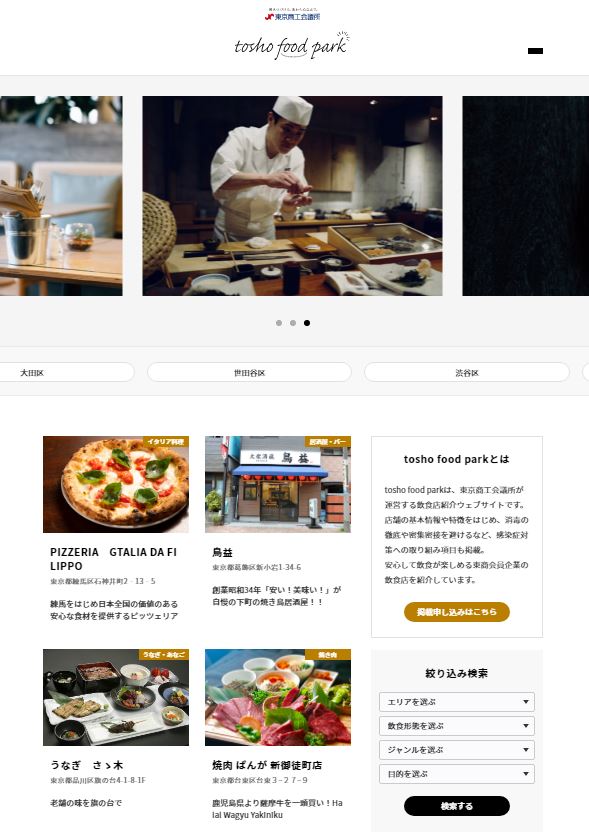 掲載については、東商会員企業であればどなたでも登録可能です(掲載は無料)。下記URLより掲載のお申込みが可能です。ぜひご登録いただくとともに、少人数での会食や様々なシーンでご活用ください!