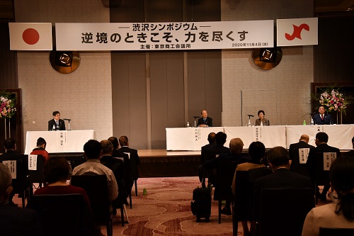 東京商工会議所は11月4日、初代会頭である渋沢栄一の精神を広く啓発するため、「渋沢シンポジウム~逆境のときこそ、力を尽くす~」を開催しました。新型コロナウイルス感染拡大防止の観点から参加者数を制限して行い、正副会頭や支部会長、会員など198人が参加しました。当日は、基調講演やパネルディスカッションを行ったほか、2021年大河ドラマ「青天を衝け」の見どころを紹介しました。