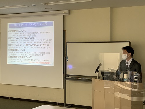 具体的には、市場動向やビジネスプラン(戦略)策定プロセスについて、新たなビジネスの想起方法や経営環境の分析・情報収集方法等について、具体的に解説いただきました。