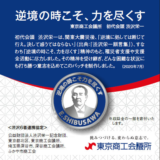 東京商工会議所 初代会頭である渋沢栄一翁(当時83歳)は、関東大震災後、「逆境の時こそ、力を尽くす」という精神のもと、罹災者支援や支援金活動に尽力しました。東商では、その精神を受け継ぎ、新型コロナウイルスという国難に対し、一致団結し、士気を高めるため、「渋沢翁ピンバッジ」を製作し、販売しています。