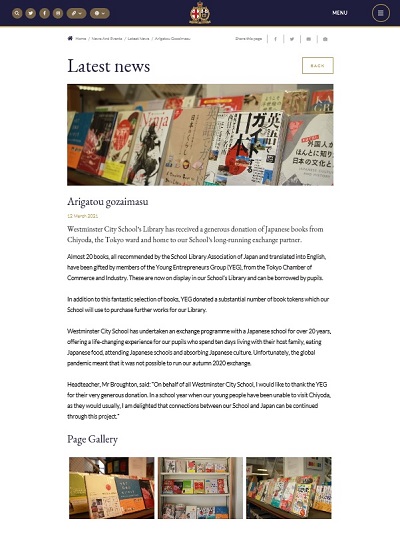 東京商工会議所千代田支部青年部(木原一雄幹事長・キハラ㈱代表取締役)は、千代田区の海外姉妹都市提携に向けた活動の一環として「イギリス現地中学高等学校への書籍寄贈企画」を実施し、このたび寄贈先であるウェストミンスター・シティ・スクールより御礼のメッセージをいただきました。
