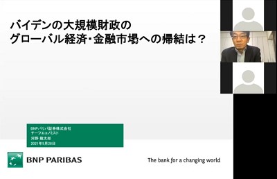 金融部会(部会長=宮田孝一・株式会社三井住友銀行会長)は5月28日(金)、BNPパリバ証券株式会社経済調査本部長チーフエコノミストの河野龍太郎氏を招き、オンライン講演会「バイデンの大規模財政のグローバル経済・金融市場への帰結は?」を開催し、57名が参加しました。なお、今回は新型コロナウイルス感染防止のため、オンライン配信での講演となりました。