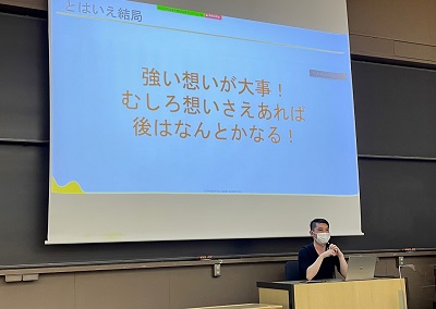 講演では、「夢をカタチに~起業・創業に対する思いと軌跡~」とのテーマで、起業に至るまでの流れやターニングポイント、スタートアップとベンチャーの違いなどについてお話しいただきました。また、学生に対して「起業するにあたっては強い想いを持つことが大切である」と困難な状況の中でも、諦めない心を持ち続けることの大切さを語られました。
